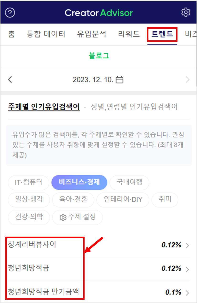 블로그 > 내블로그 > 통계 > Createor Advisor > 트렌드를 선택합니다.