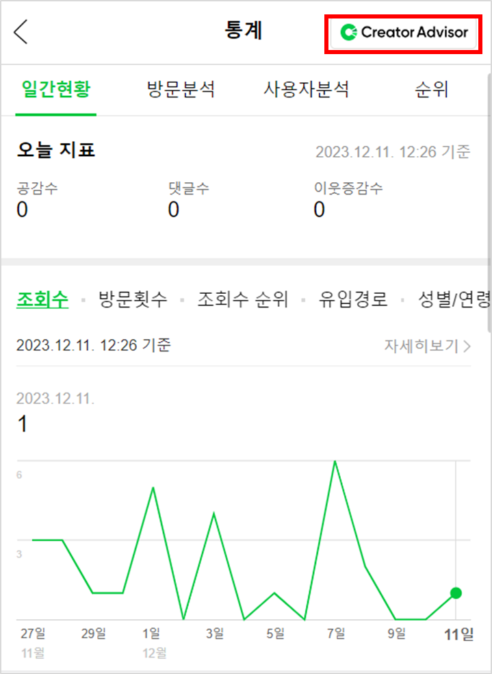 블로그 > 내블로그 > 통계 > Createor Advisor > 트렌드를 선택합니다.
