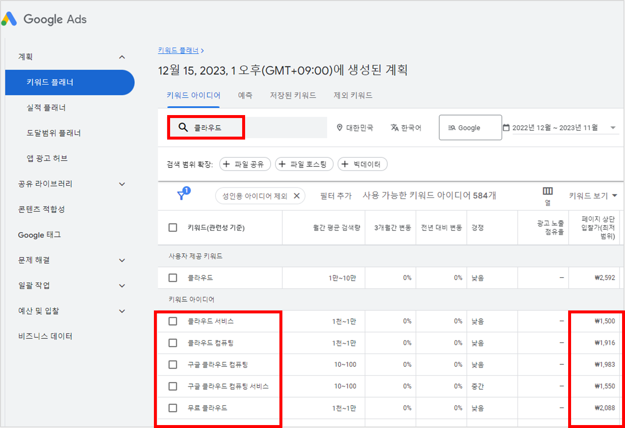 클라우드 키워드와 관련된 키워드 아이디어들이 보이고 해당 페이지 상단의 입찰가에 보입니다.