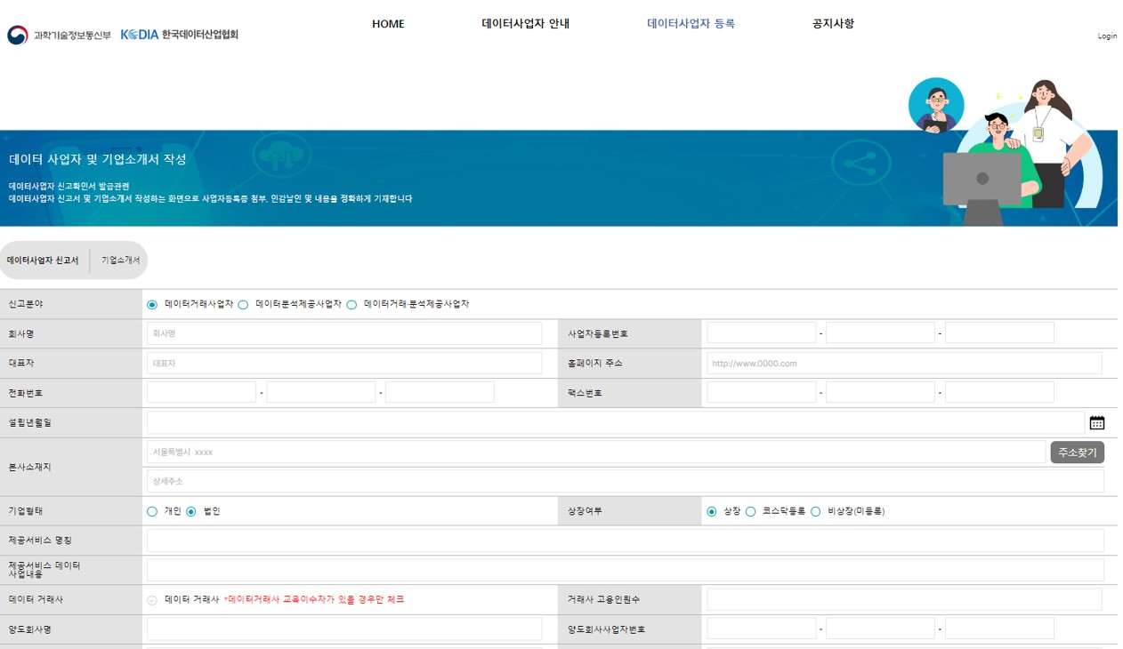 데이터사업자 등록을 받으려면 신고서와 함께 사업자등록증 사본, 기업소개서 각 1부를 시스템으로 제출하면 됩니다.