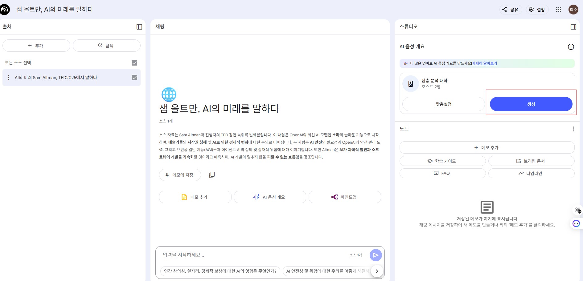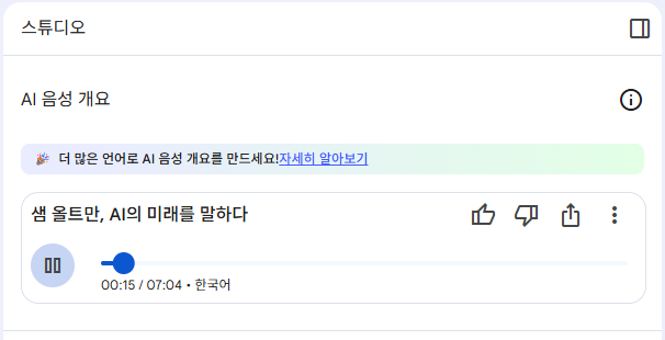 - AI 음성 개요 생성: 우측 'AI 음성 개요' 섹션에서 '생성' 버튼을 누릅니다. 잠시 기다리면...