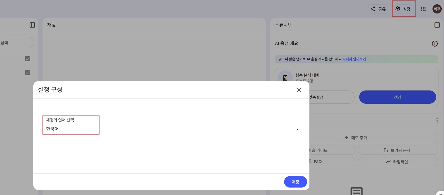 - 출력 언어 설정 (한국어): 우측 상단 '설정'에서 '출력 언어'를 '한국어'로 변경합니다. (최초 한 번만 설정하면 됩니다!)