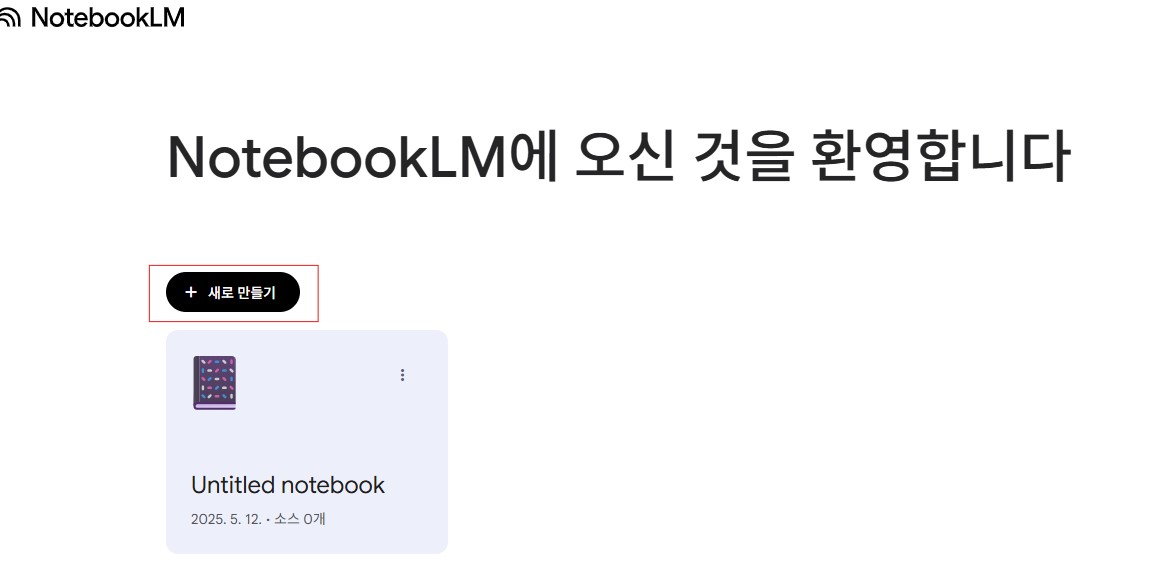 - NotebookLM에 접속 후 '새로 만들기': 구글 NotebookLM 사이트에 접속하여 '새로 만들기'를 클릭합니다.