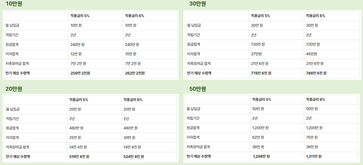 금액별 만기 예상 수령액 (10만 원/20만 원/30만 원/50만 원)